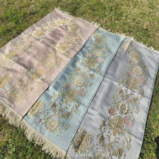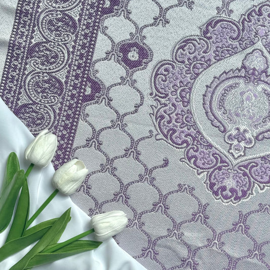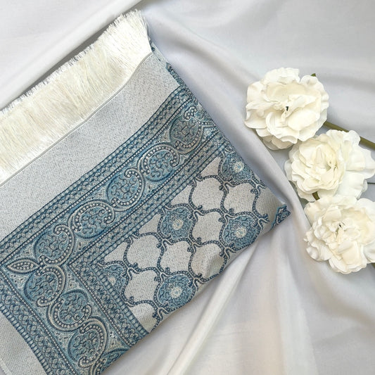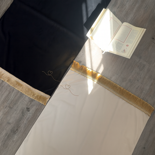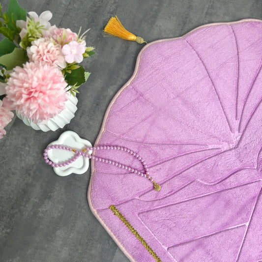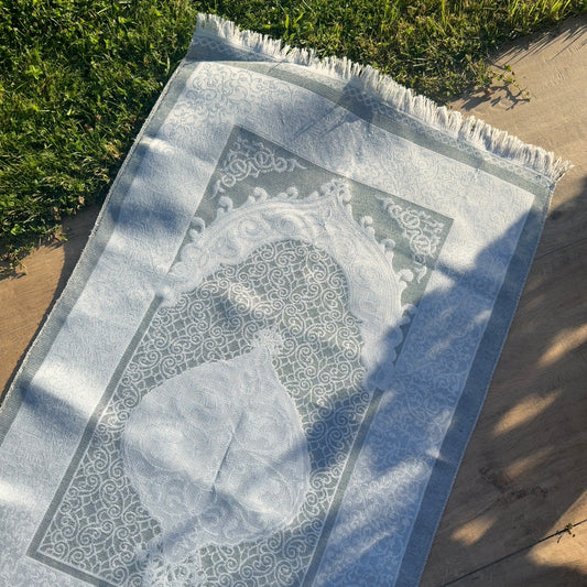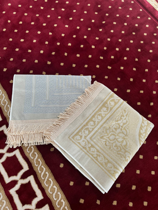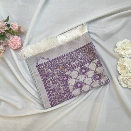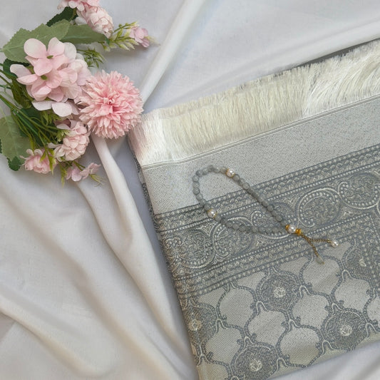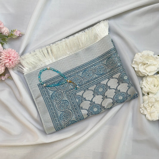 A stylish set with prayer rug and matching Tasbih, and matching accessories; perfect for home, travel, or as a gift.