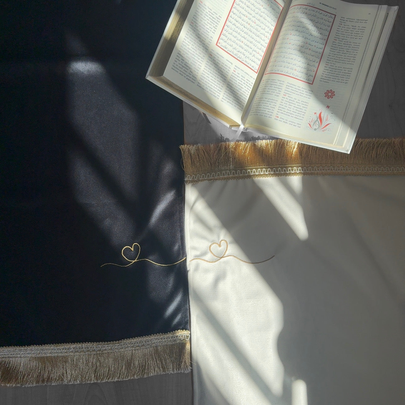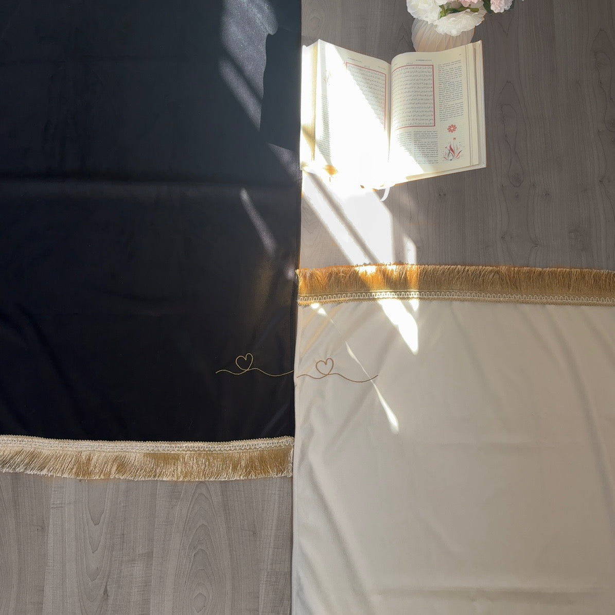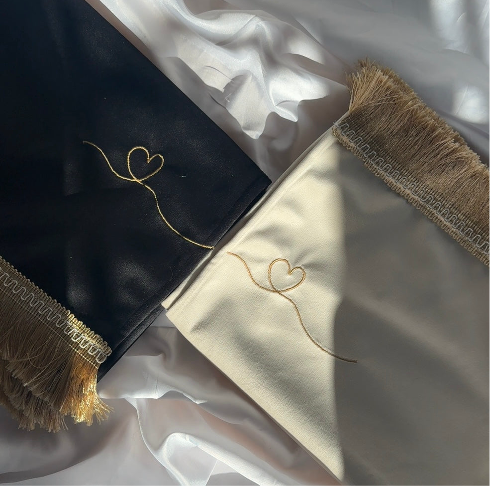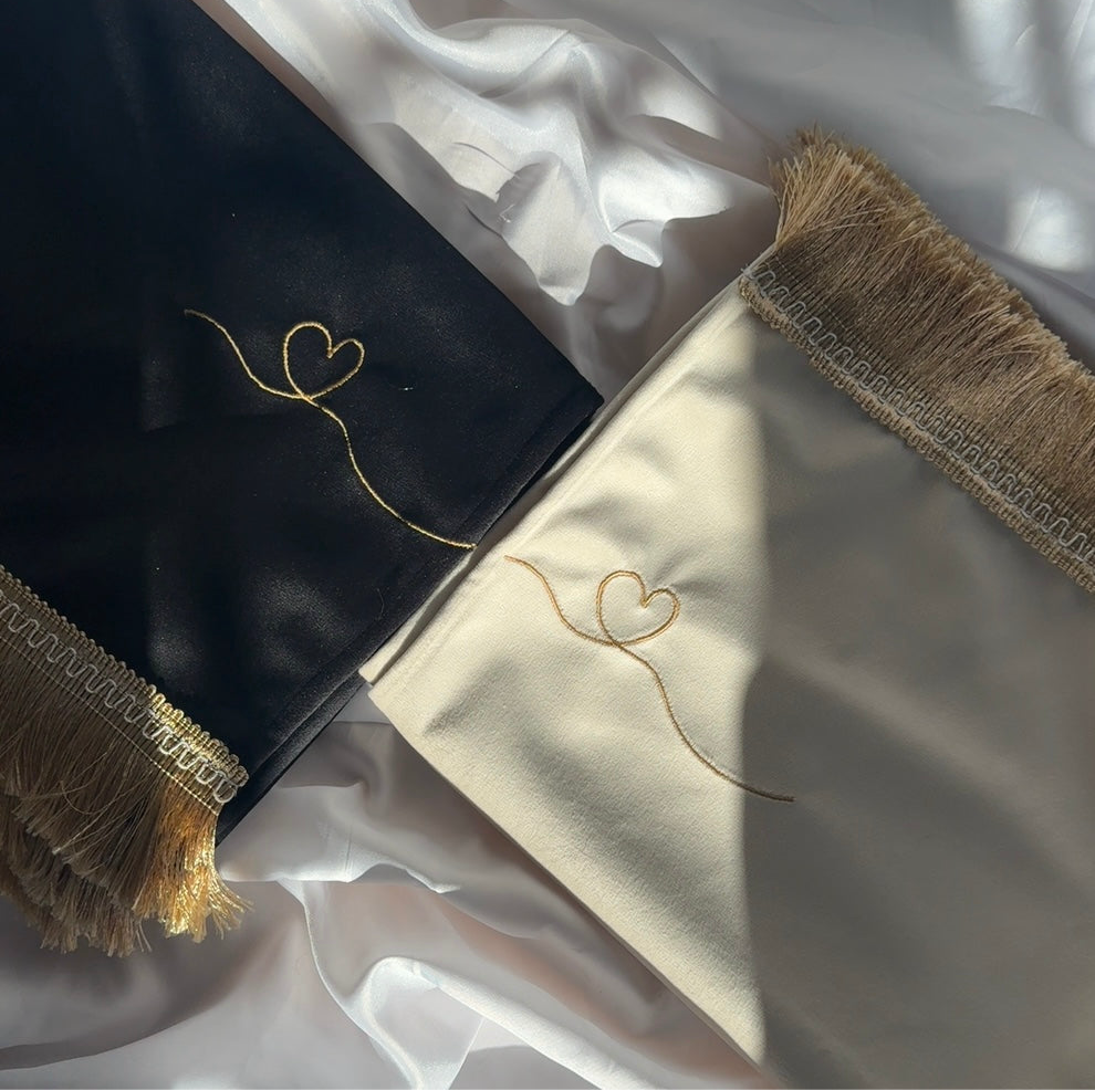 A beautiful set of partner prayer mats, designed in elegant black and white with delicate golden details. Perfect for couples who wish to share their moments of worship side by side.