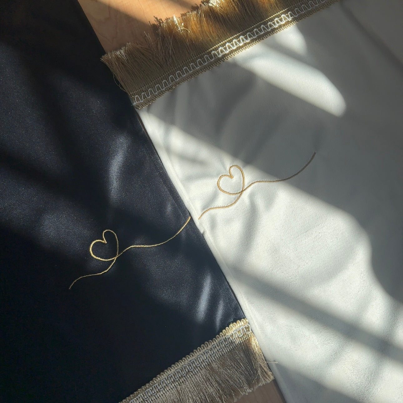 ✨ Decorated with simple heart embroidery and golden fringes for a touch of elegance.